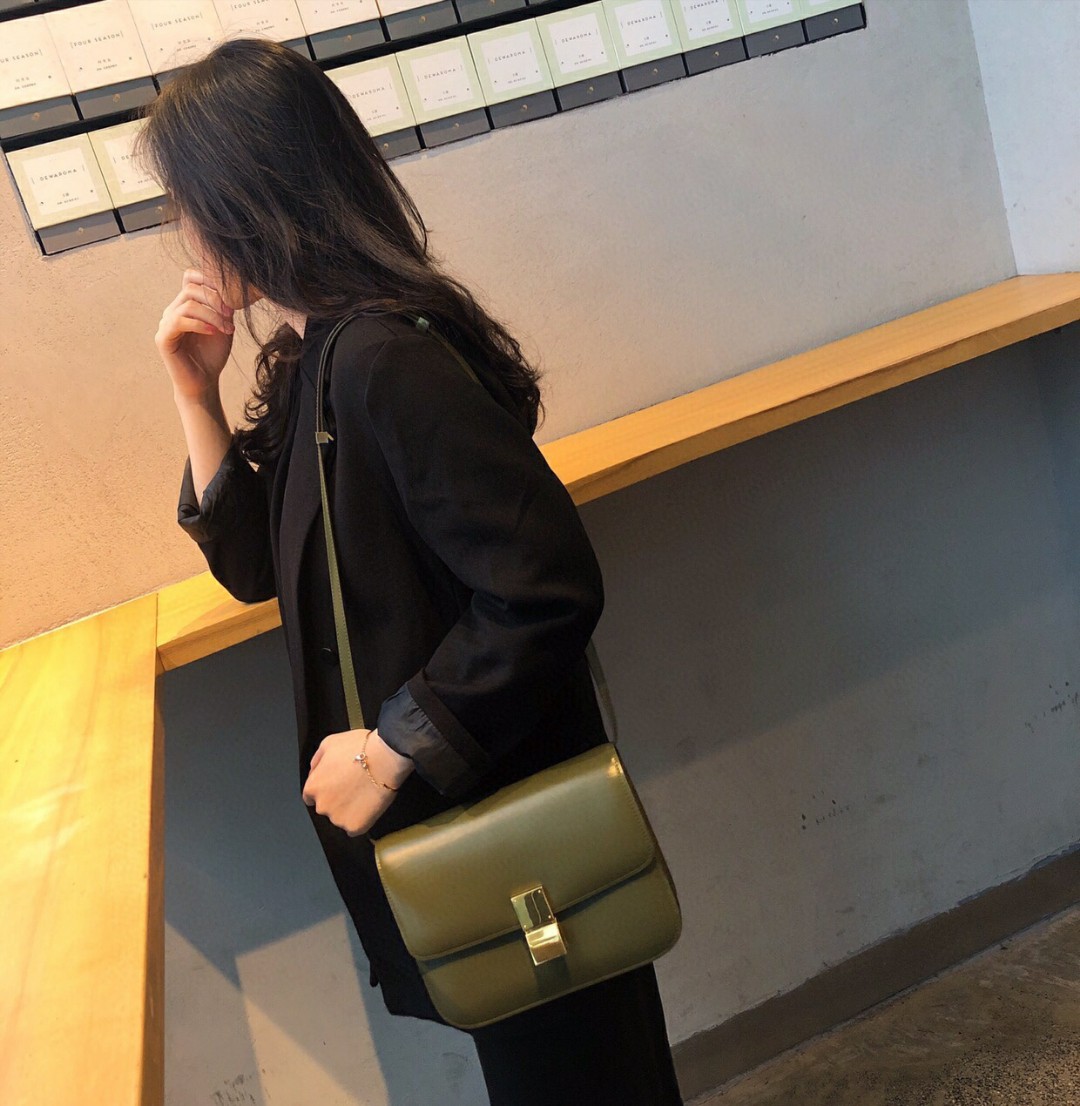 Celine CLASSIC 思琳中号手袋军绿色189173DLS.31GR上身图。CLASSIC中号抛光牛皮革手袋。军绿色。CLASSIC中号手袋,附1条可调节及可拆卸皮革肩带和1个黄铜搭扣。