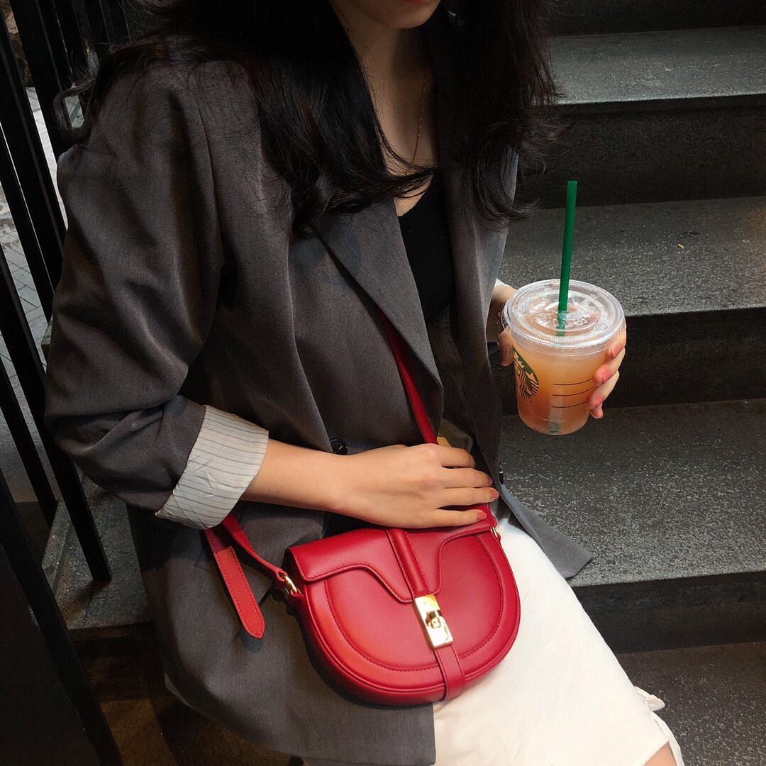 BESACE 16 小号缎面牛皮革手袋。红色。16 小号缎面牛皮革手袋,皮革手柄,附1条可调节肩带,翻盖下外侧设1个扁平口袋。黄铜扭锁闭合,CELINE挂锁配皮革钥匙套。
