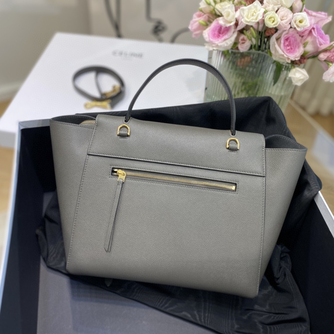 BELT迷你粒面牛皮革手袋。灰色。BELT MINI迷你刺绣手袋,附1个皮革手柄,1条可拆卸肩带,背面外设1个拉链口袋。这款手袋具备两种闭合方式:顶部翻盖和拉链。