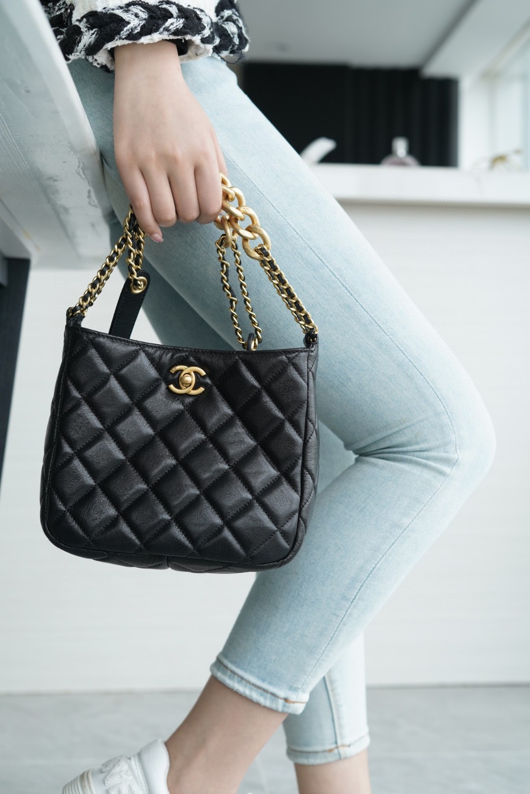 𝗖𝗛𝗔𝗡𝗘𝗟 22P 复古嬉皮包。采用亮面褶皱羊皮,皮质质感又辣又酷,通透的皮面,光泽度恰到好处,拼接的皮链条融合了复古味和女人味,包身简洁风格百搭,容量大的同时,兼具时尚感是日常出街的搭配利器,赞赞赞️