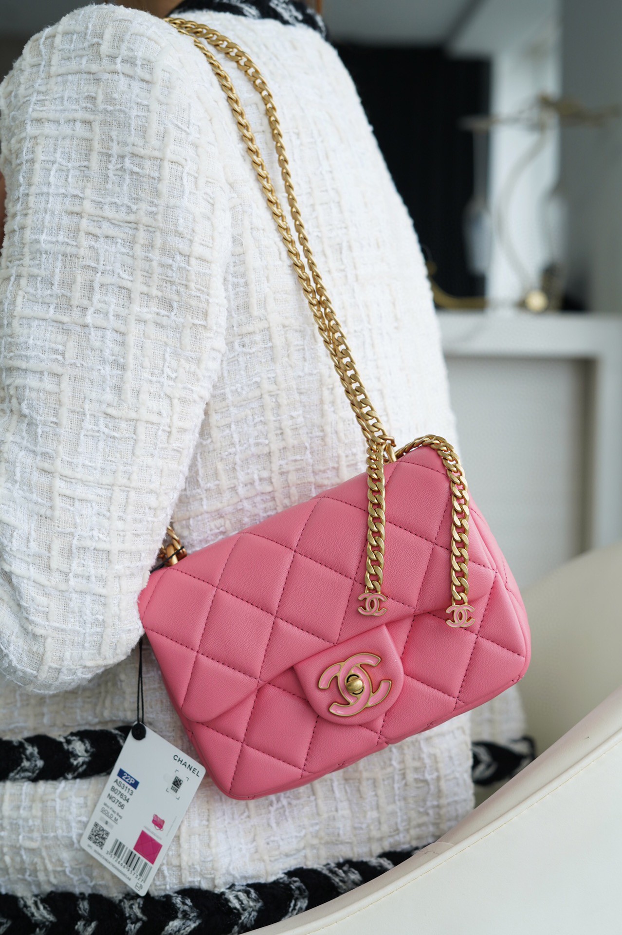 𝗖𝗛𝗔𝗡𝗘𝗟香奈儿口盖包2022珐琅扣方胖子 粉色香奈儿女式包包。𝗖𝗛𝗔𝗡𝗘𝗟 𝟐𝟐𝗣珐琅扣方胖子 粉色。『方框开料部』小羊皮#在经典的CF款式上搭配了珐琅扣小吊坠作为点缀显得更加的灵动精致,巧妙搭配起来可以洋气到爆喔~多种风格背法,可 ❶斜挎 ❷单肩 ❸手拎 ❹腋下包 哪种Style更让你心喜呢❓