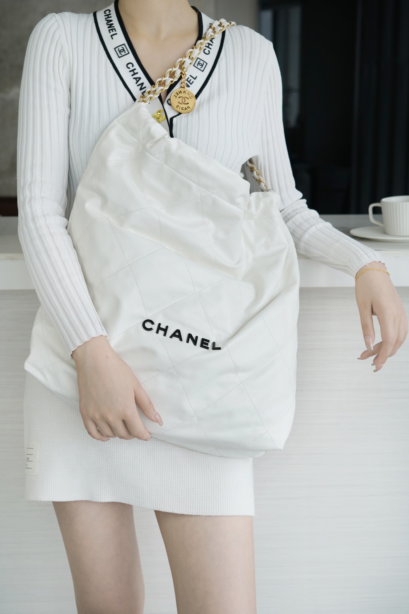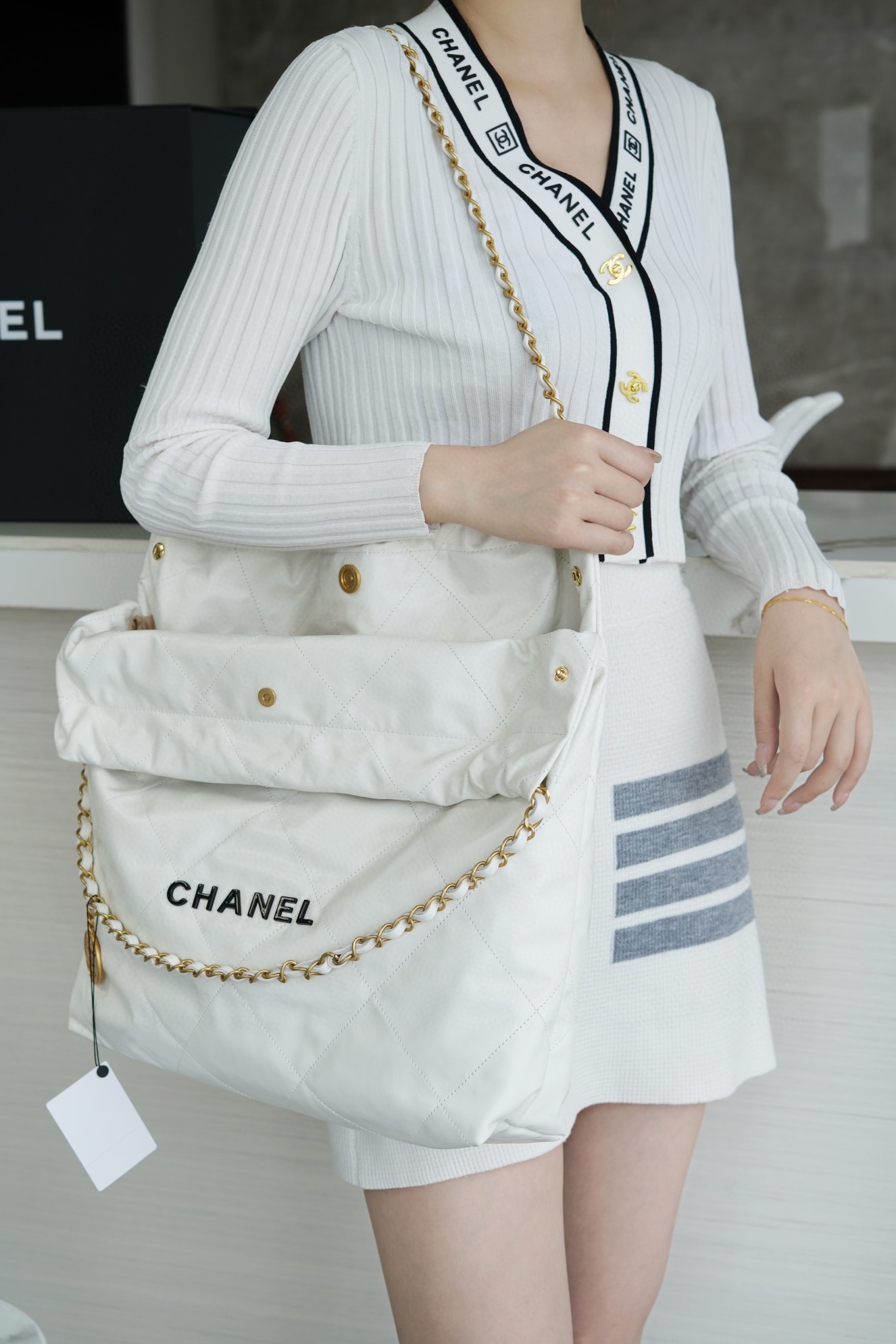 顶部抽绳双链设计用双 C Logo 连接下半段单链,底部左右各一个小耳朵用 Logo “铆钉”固定单链尾端,内里有 一个拉链隔层 一条钥匙链 方便挂钥匙等小物件…将简约舒适融为一体,为你打包整个春日