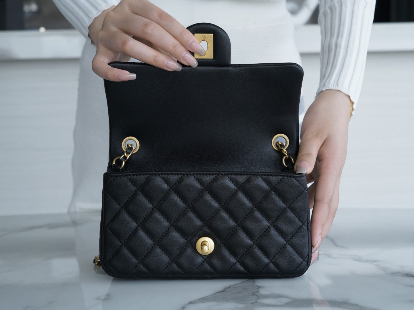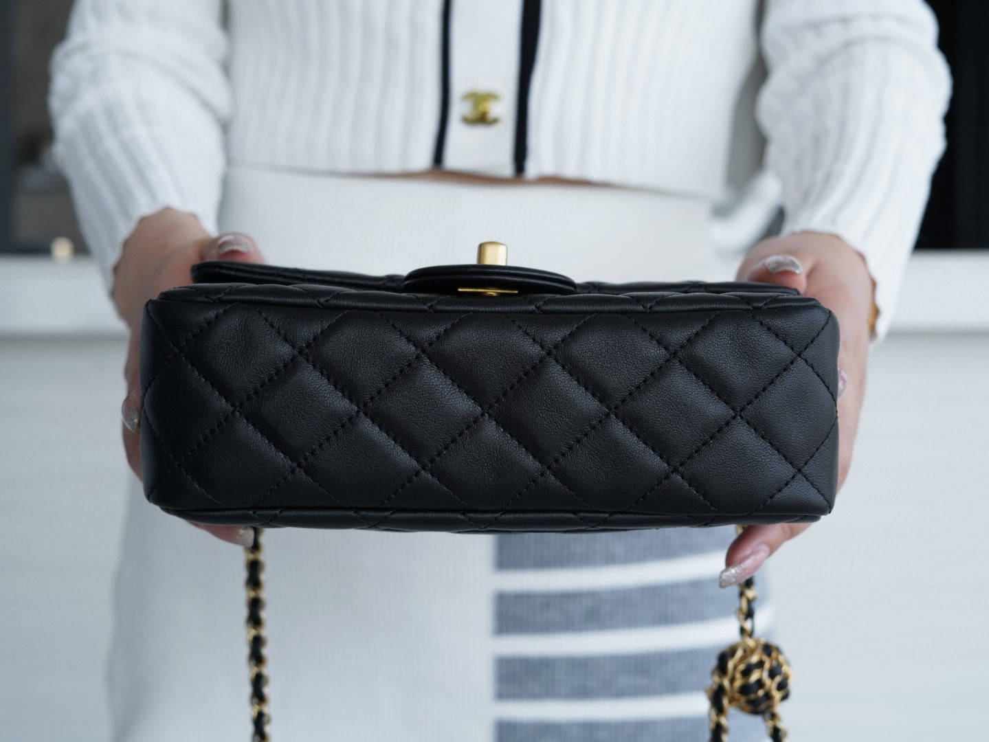 【正品实拍】𝗖𝗛𝗔𝗡𝗘𝗟 22s 编织金球𝐂𝐅大𝐦𝐢𝐧𝐢。以柔韧细腻的羊皮打造,经典菱格纹设计,皮穿金属链条⛓️搭配“核桃”小金球,整颗金球换成穿皮编织元素,而编织更显工艺,链条可随意调节长度,金色内里高级感满满,是我心中的梦中情包没错了🤩