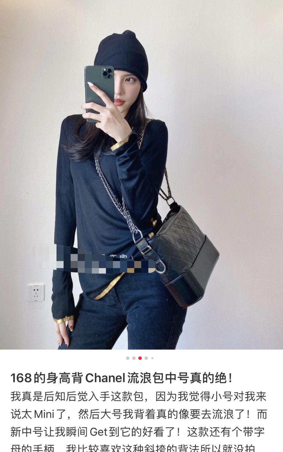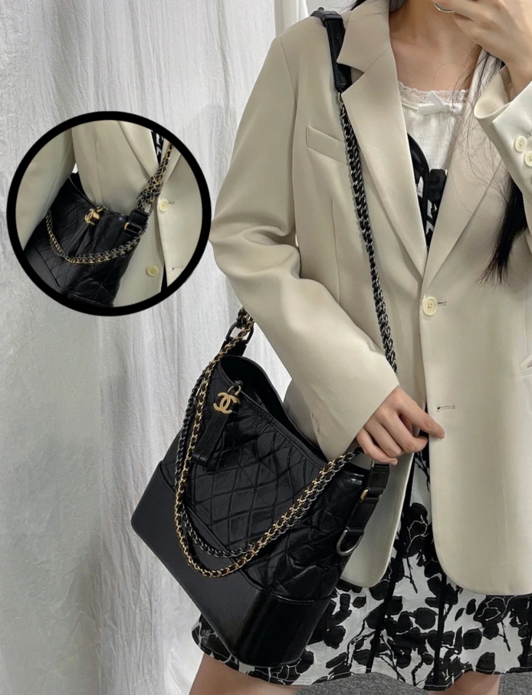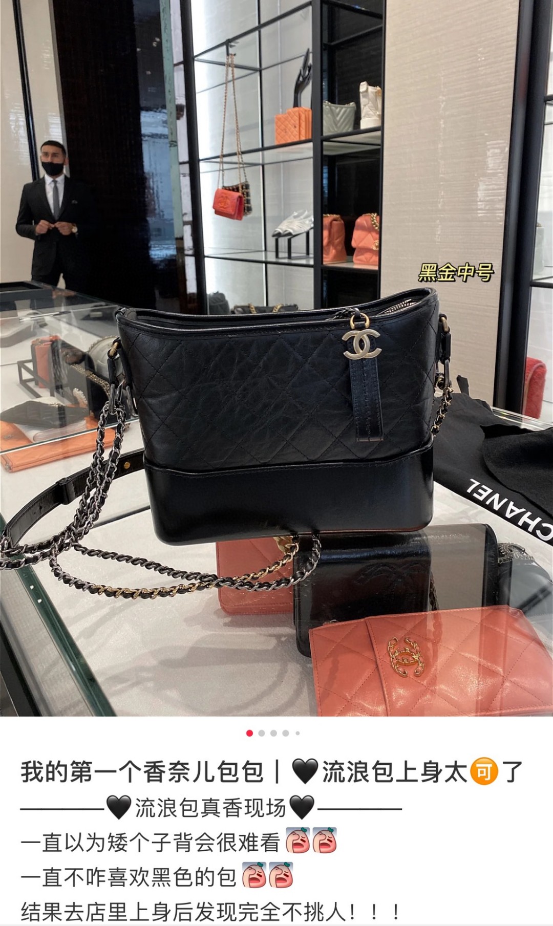 chanel gabrielle 经典流浪包 黑色 大号。意大利独家定制胎牛皮,纹路自然无规则,正品神韵十足!采用了上下质地形成鲜明对比的新型结构,热压成型的底部光亮挺括,包身却又极为细腻柔软,底部能够始终保持立体形状。上身风格多变,休闲百搭。