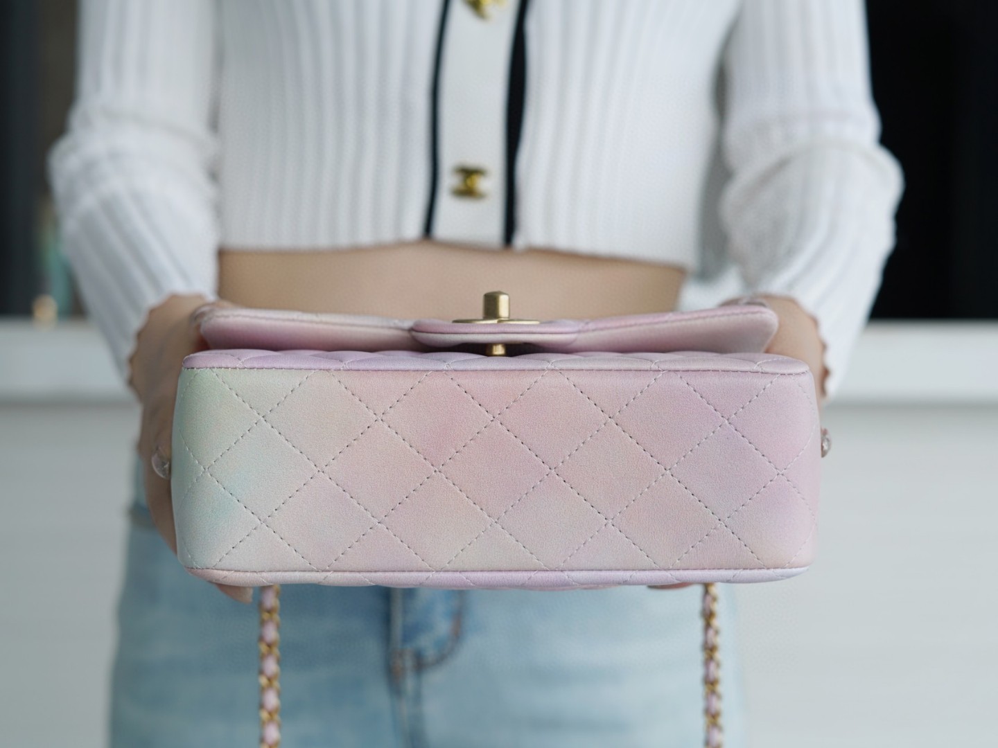 chanel 2022新款手提cf迷你渐变粉香奈儿口盖包配手柄。【正品实拍】chanel 2022新款手提cf迷你渐变粉。这款𝑴𝒊𝒏𝒊 𝒄𝒇 𝒕𝒐𝒑 𝒉𝒂𝒏𝒅𝒍𝒆被称为香奈儿22P包中之王!𝑀𝑖𝑛𝑖与𝐶𝑜𝑐𝑜 ℎ𝑎𝑛𝑑𝑙𝑒的结合体,经典与端庄,包包整体很有质感。这一季颜色简直绝了哇一眼瞬间沦陷💕摆在那都散发着迷人的光芒,充满夏日活力。