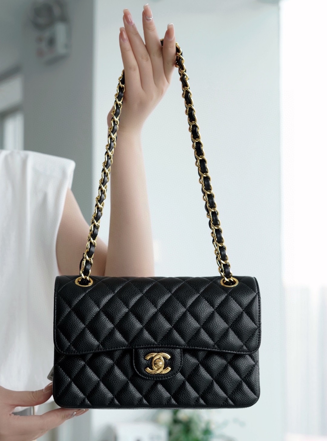 chanelClassic Flap经典口盖包黑牛金 小号香奈儿女款包包。经典口盖包 黑牛金 小号〰️低调高级 感叹一句早买早香。进口渠道定制小牛皮🐂,颗粒感,光泽度,软度并存的一级小牛皮鱼子酱,包身挺阔菱格饱满,经典菱格纹设计与皮穿金属的链条搭配, 可以说是小香的传统,见证了时光沉淀的一款包包,专家认定的保值款啦