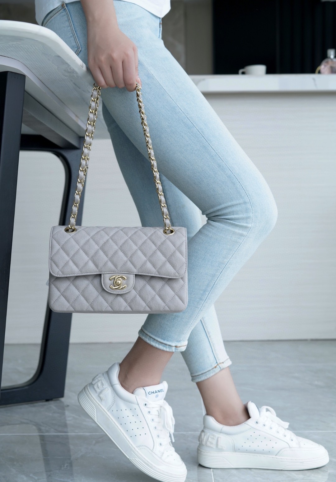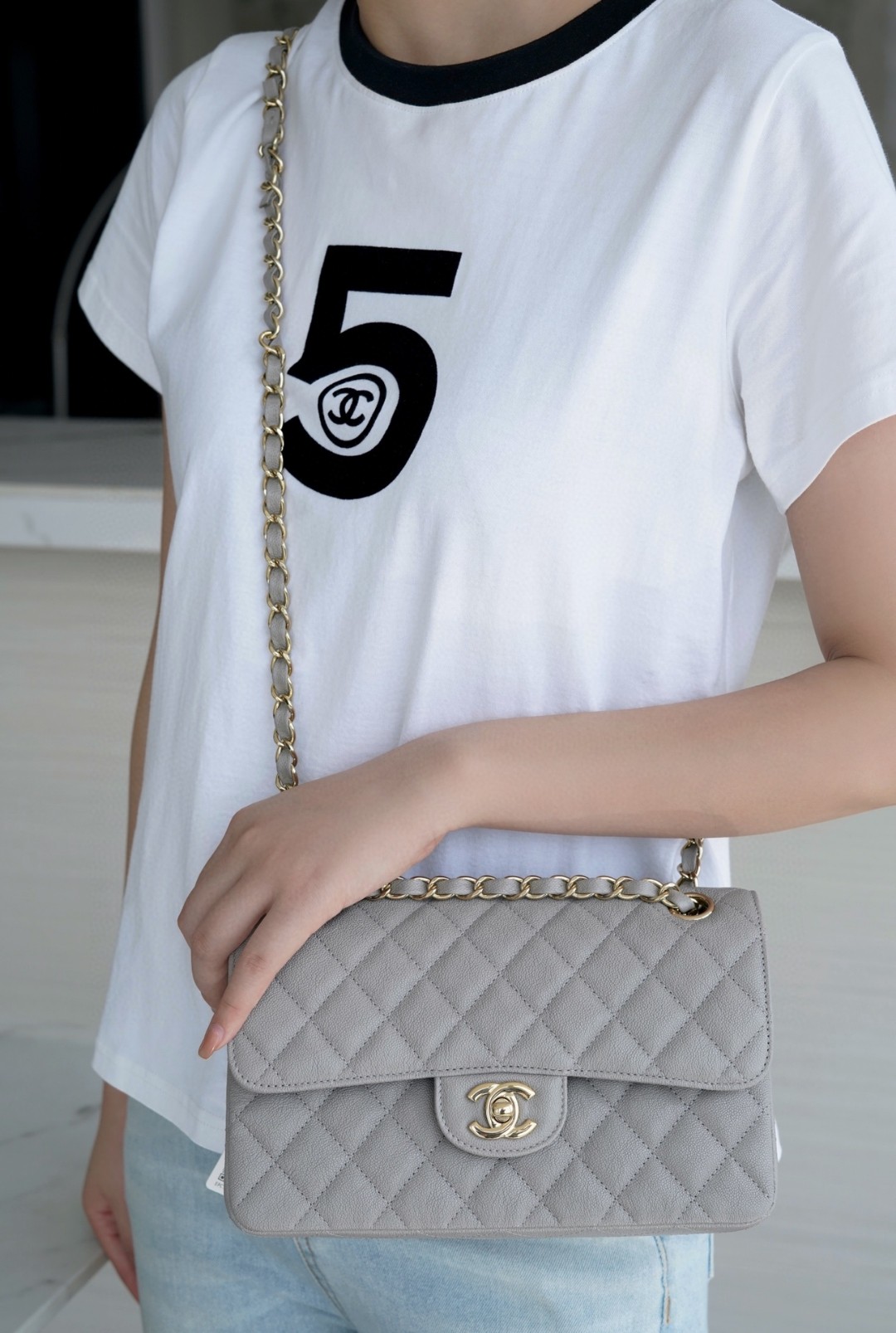 水洗胎牛 小号浅灰,水洗胎牛皮的皮胚都是采用刚出生最为细腻的的牛宝宝! 制作成水洗鱼子酱更是体现出了𝐶ℎ𝑎𝑛𝑒𝑙对手感的追求! 皮料的特性:颗粒非常细小、有水洗过的感觉,皮面油光锃亮,会有不规则的复古皱纹感,手感更是独一无二! ◡̈︎一个字:软̃❗️