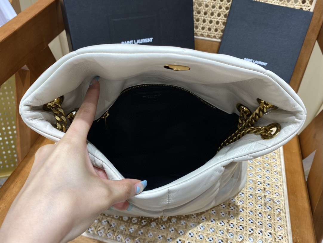 【正品原廠皮】白色小號金扣.LOULOU PUFFER 絎縫小羊皮包,原廠正品皮制作,手感柔軟細膩,猶如懷抱雲朵️般的感受;經典的Y家logo、鏈條及扣眼五金均採用全黑色電鍍金屬材質,整個包散發猶如黑夜般的魅惑吸引氣質!正品皮!正品皮!正品皮!