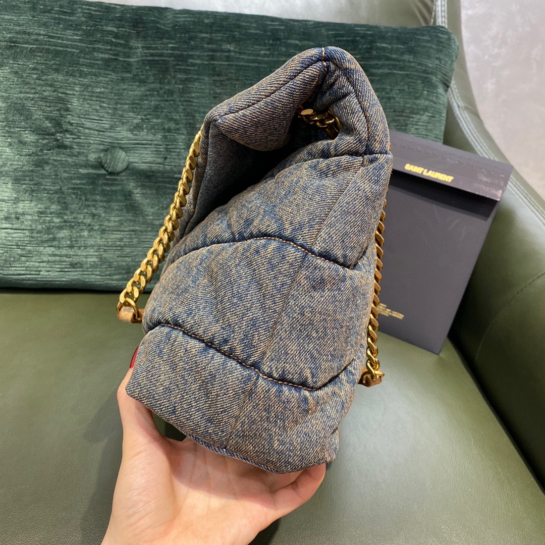 【最新牛仔紋】LOULOU PUFFER 牛仔佈紋大號絎縫包,極致牛仔水洗工藝,手感柔軟舒適,猶如懷抱雲朵般的感受;經典的Y家logo、鏈條及扣眼五金均採宗古銅金色五金,包袋開口處摺疊後使用了磁性四合扣封口,密閉性及安全性一流;包內設有一個拉鏈內袋可放置手機及貴重物品,除此之外無多余內袋設計,使用起來隨心所欲!