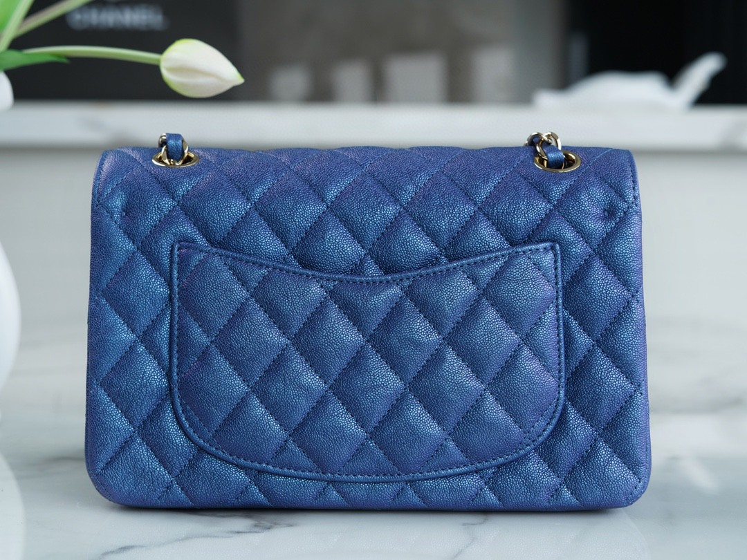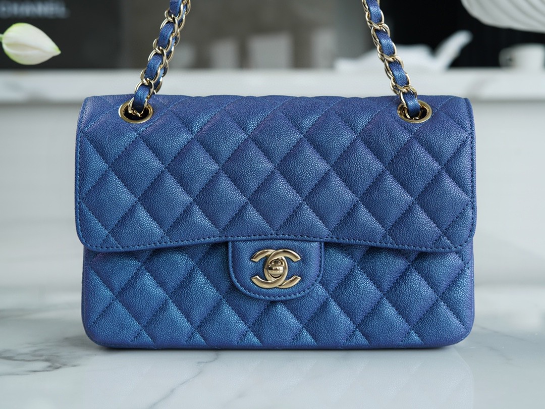 cf classic flap水洗胎牛正品皮小號 珠光藍。真正具有收藏價值的【𝒊𝒏𝒄𝒂𝒔】水洗胎牛皮,經過滾筒水洗做舊工藝淬煉,衍出不規則的自然皮紋,每一個都是獨一無二。特殊工藝做舊復古風,又不缺乏質感,促使包包有特色又不失大氣。越用皮面光澤度越飽滿,真正的底光由內散發至外。