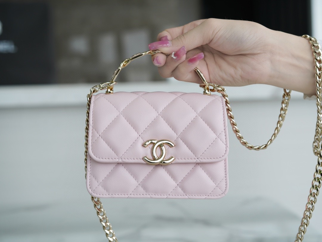 chanel22s 琺瑯手柄鏈條包 粉色。意大利【GR】原廠小羊皮,經典菱格紋+標誌性雙𝐂 𝐥𝐨𝐠𝐨設計,迷妳包型搭配粗鏈條呈現出一種反差萌感,包裏自帶卡槽,鏈條⛓可拆卸,斜挎手拎都🉑,琺瑯扣設計真的經典又好看,減齡百搭神器~