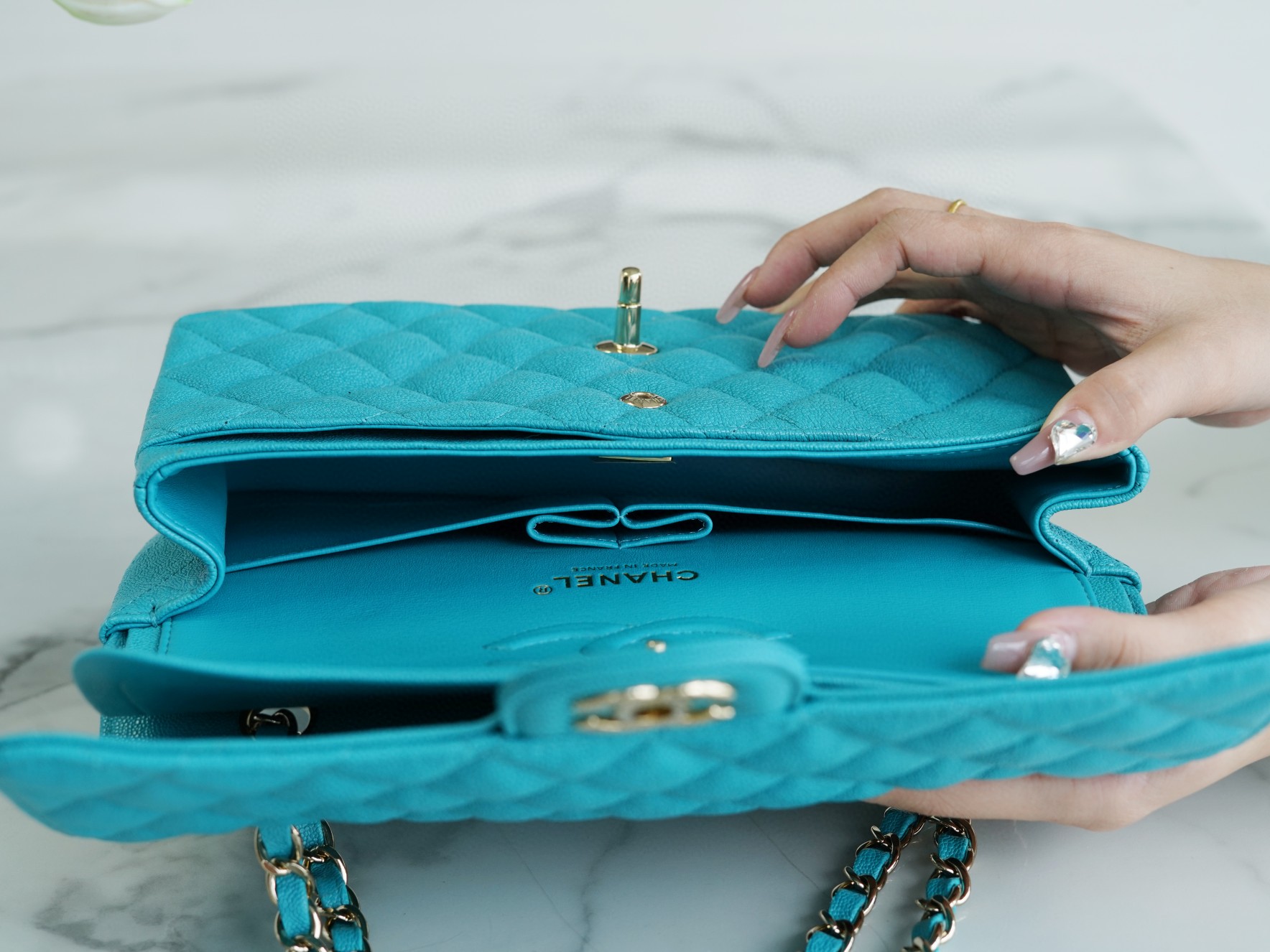 cf classic flap 水洗胎牛 中號 孔雀藍。水洗胎牛皮的皮胚都是採用剛出生最為細膩的的牛寶寶! 制作成水洗魚子醬更是體現出了𝐶ℎ𝑎𝑛𝑒𝑙對手感的追求! 皮料的特性:顆粒非常細小、有水洗過的感覺,皮面油光鋥亮,會有不規則的復古皺紋感,手感更是獨一無二! ◡̈︎一個字:軟̃❗️