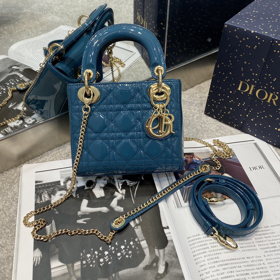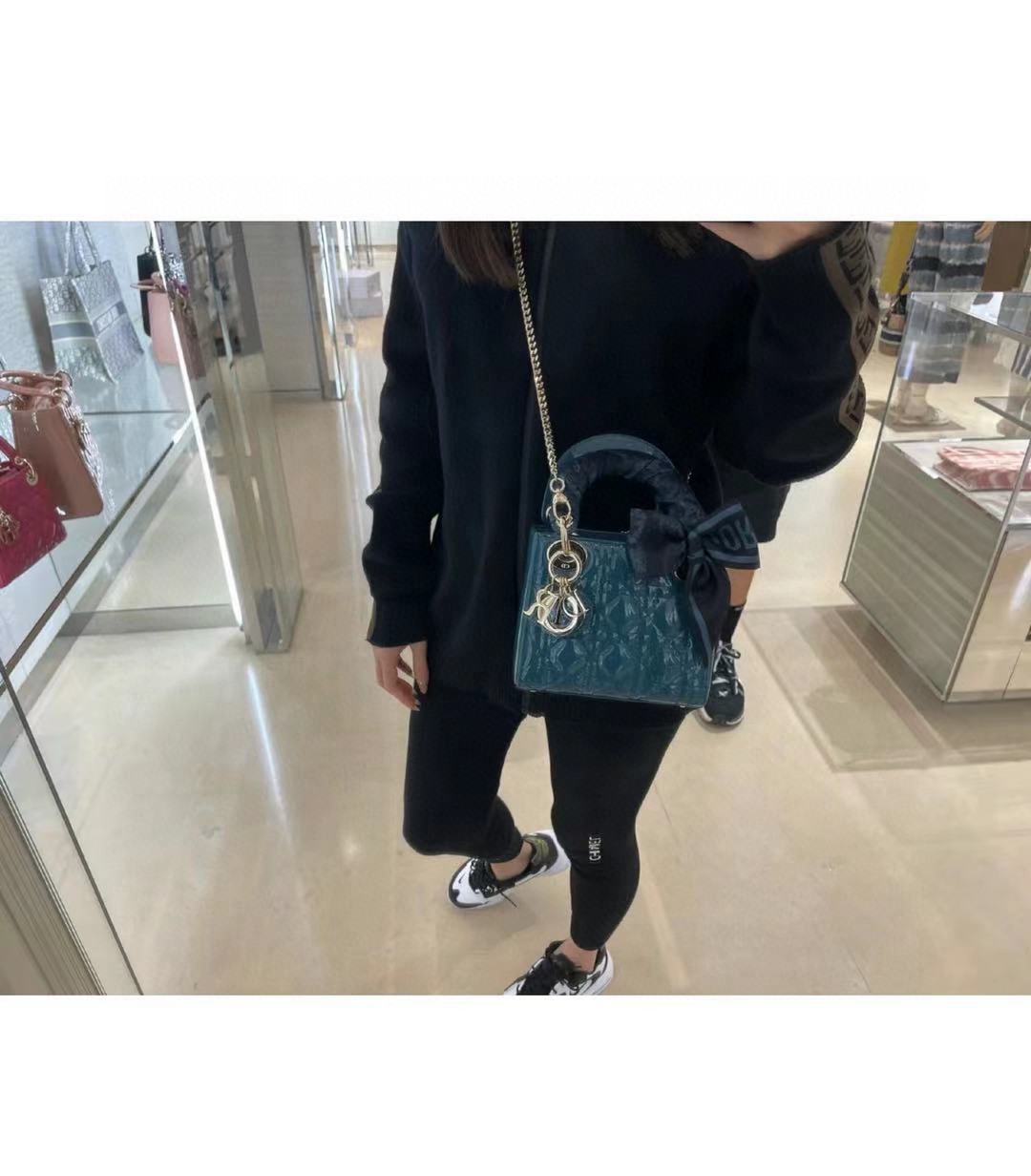 迪奥三格漆皮手袋LADY DIOR M0505OWCB_M71P 17CM 上身效果图 迷你 LADY DIOR 手袋 海洋蓝漆皮牛皮革藤格纹