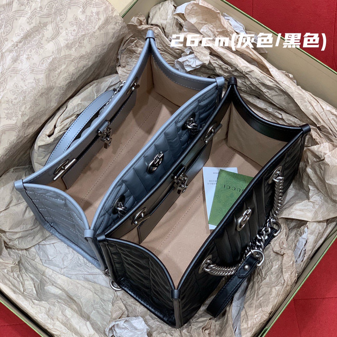 gucci Marmont几何 购物袋女古驰官网 681483 UM8BN 1000 古驰《Aria-时尚咏叹调》系列不断探索品牌典藏元素,透过经典与现代相融合的手法讲述古驰的设计故事。GG Marmont系列是品牌创作总监入职初期创作的代表之作,在每一季都会透过新鲜视角融入更多内涵和新意。这款托特包采用黑色绗缝皮革制作,搭配复古风格的古银色调配件。