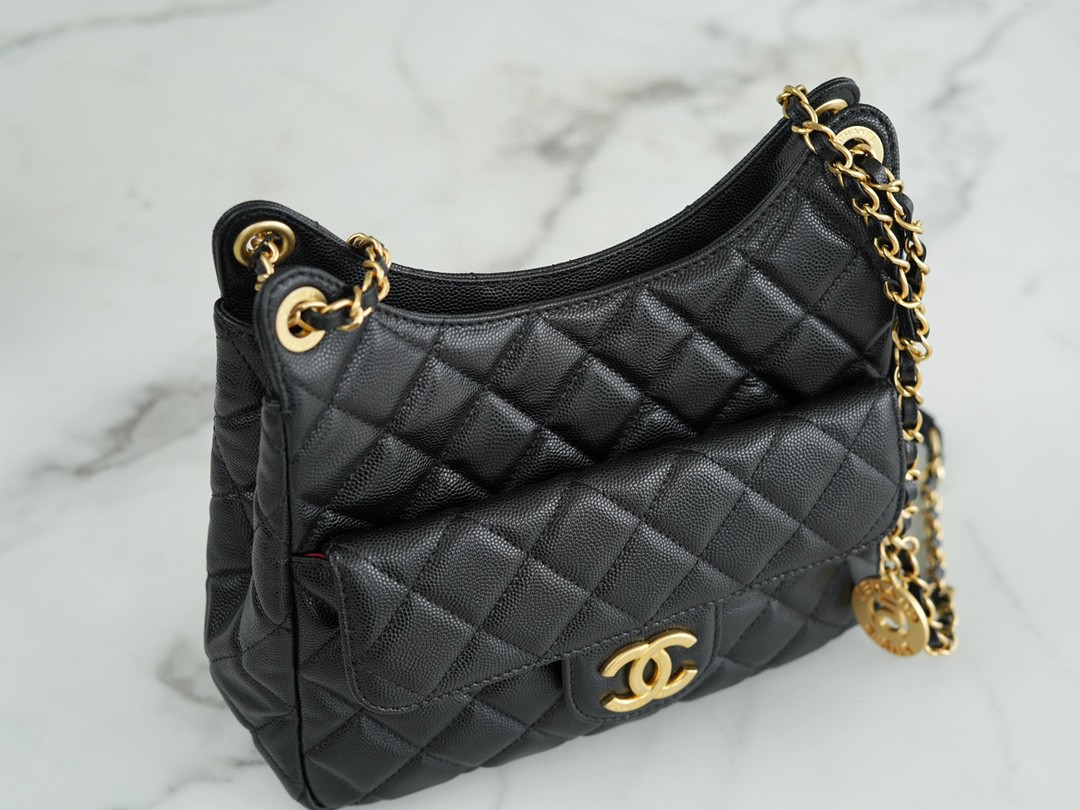 原廠魚子醬材質,包型復古特別,小貓的造型感更襯托女人的性感可愛的一面,鏤空的5⃝號徽章金幣,前冊的小口袋以及小金幣掛墜都增加了整體的層次感,非常可觀的容量,今年的實用流浪包非它莫屬