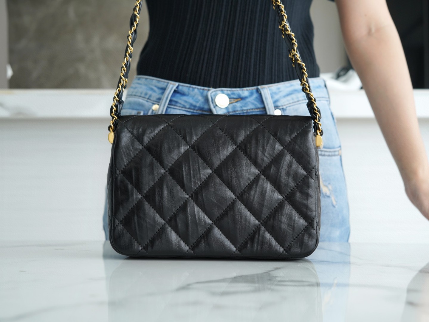 寬肩帶黑金褶皺牛皮,經典菱格紋設計與皮穿金屬的鏈條搭配,延續了19的經典元素,超級顯精致~斜挎單背都超颯,隨性 簡單、上身自帶時髦.