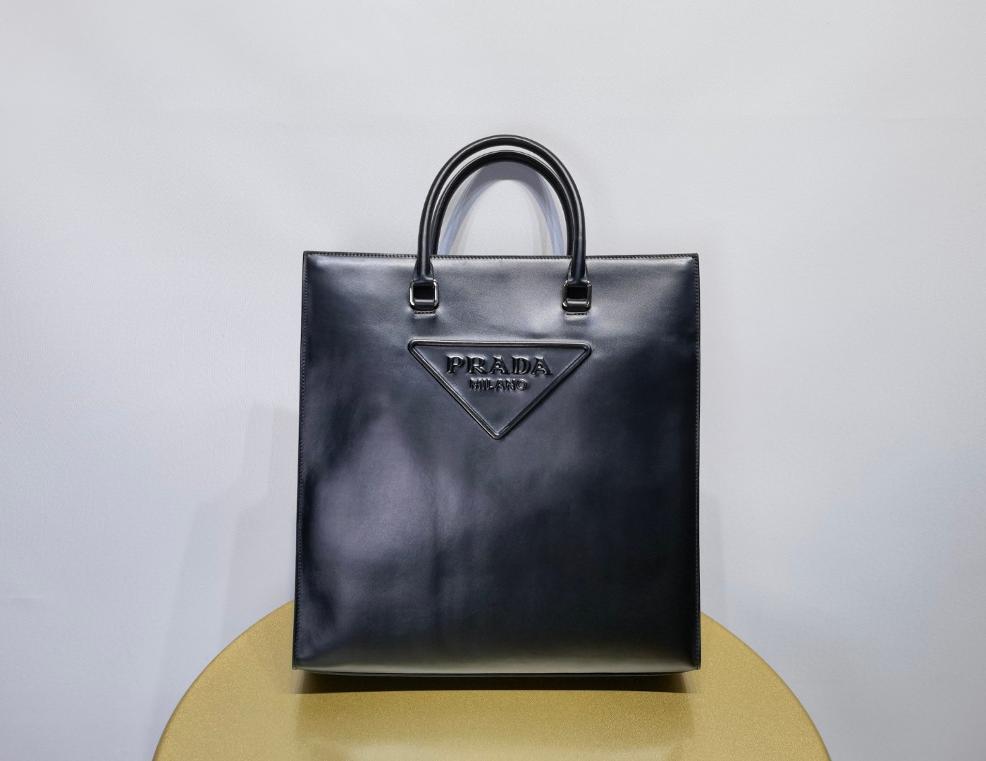 帥大空間 時尚簡約的托特包,採用小牛皮制作,品牌標誌性的三角形徽標化身大幅壓花細節,鋪陳於正面,精細且高級,精致型男必入