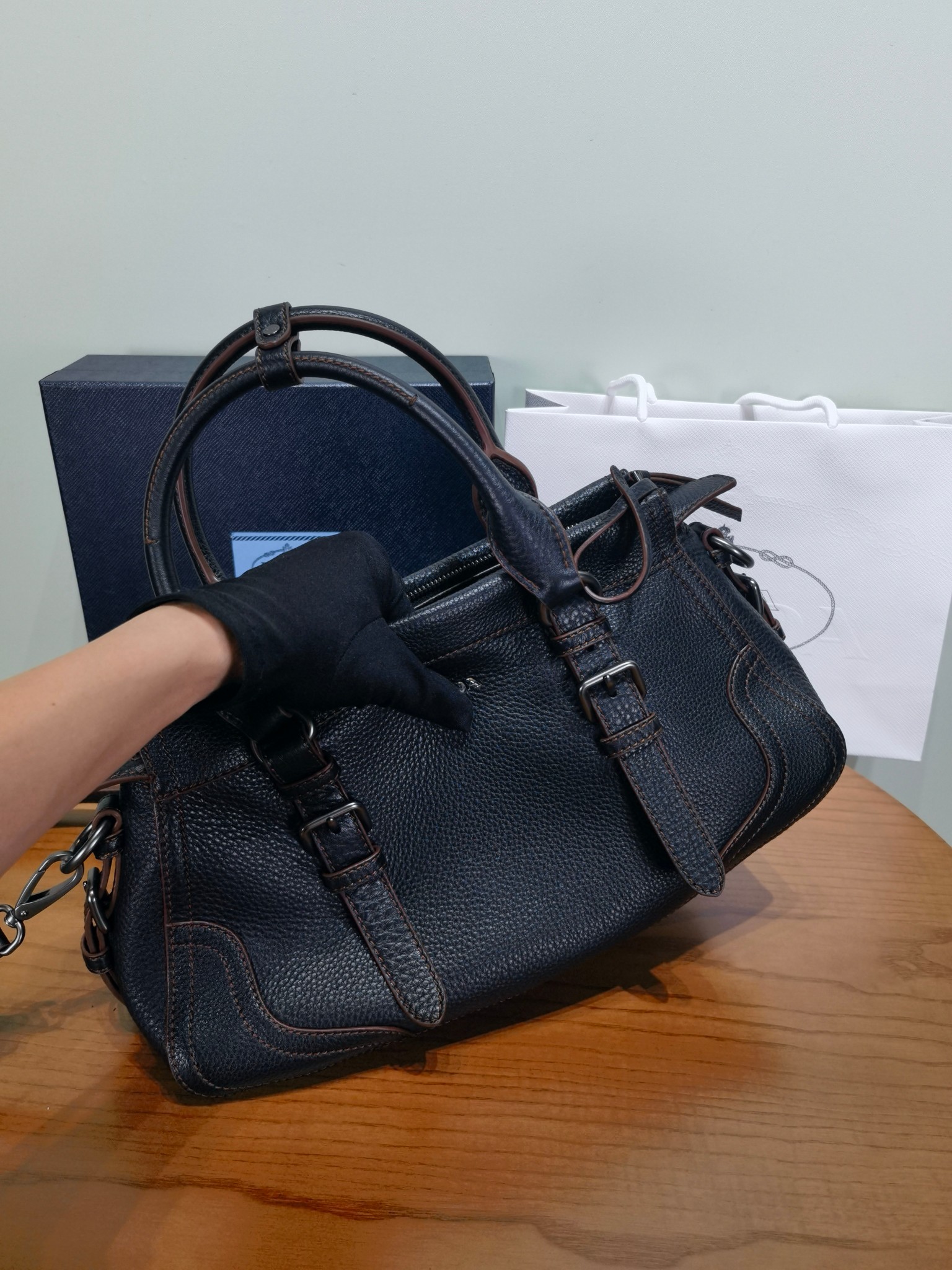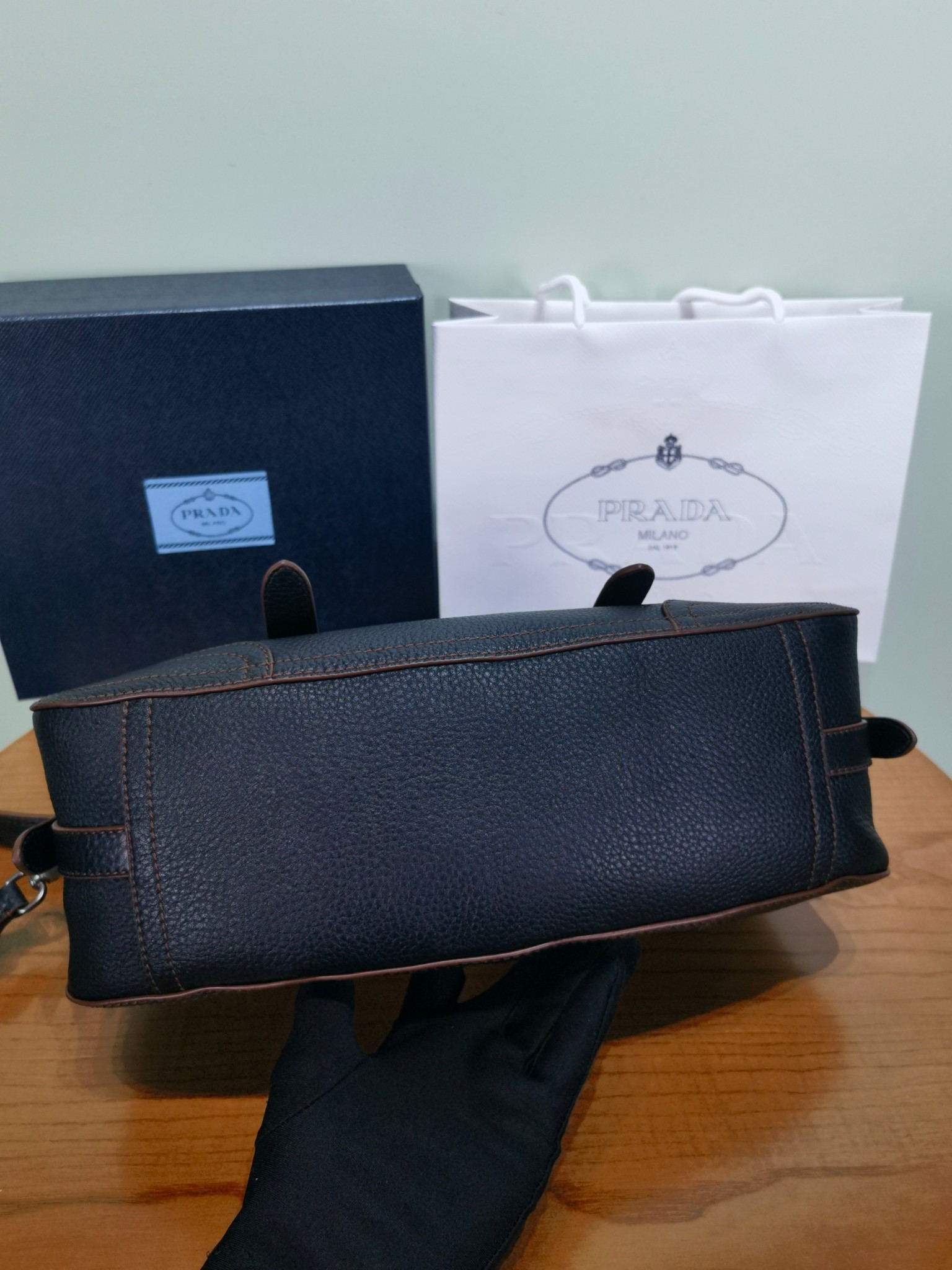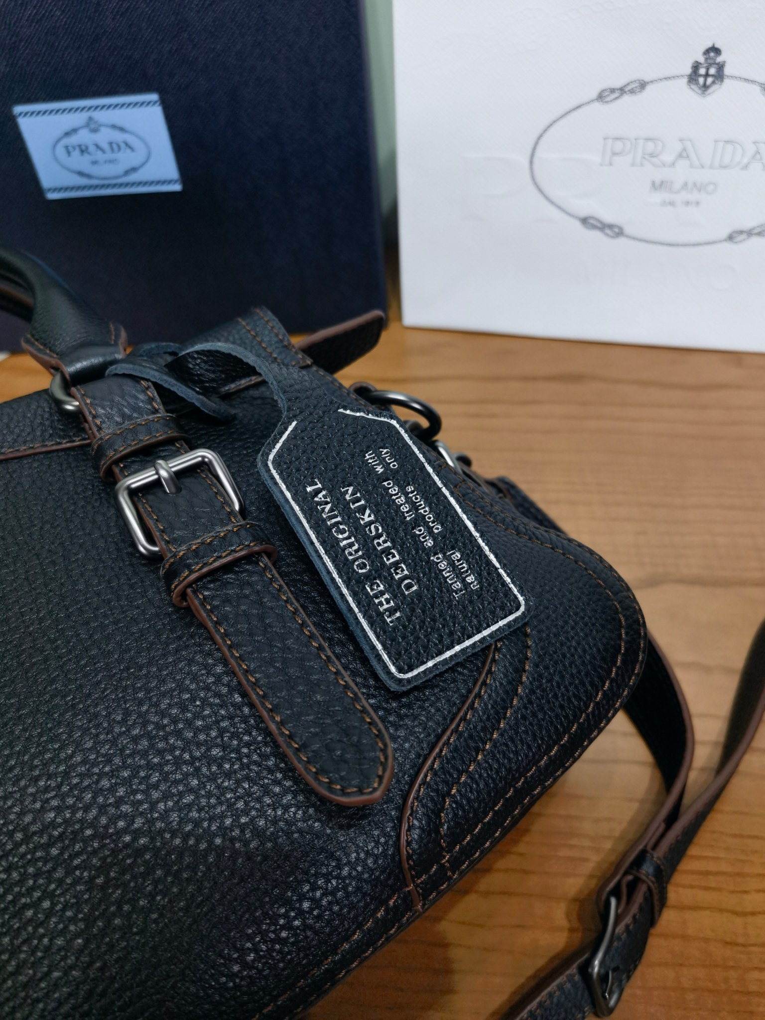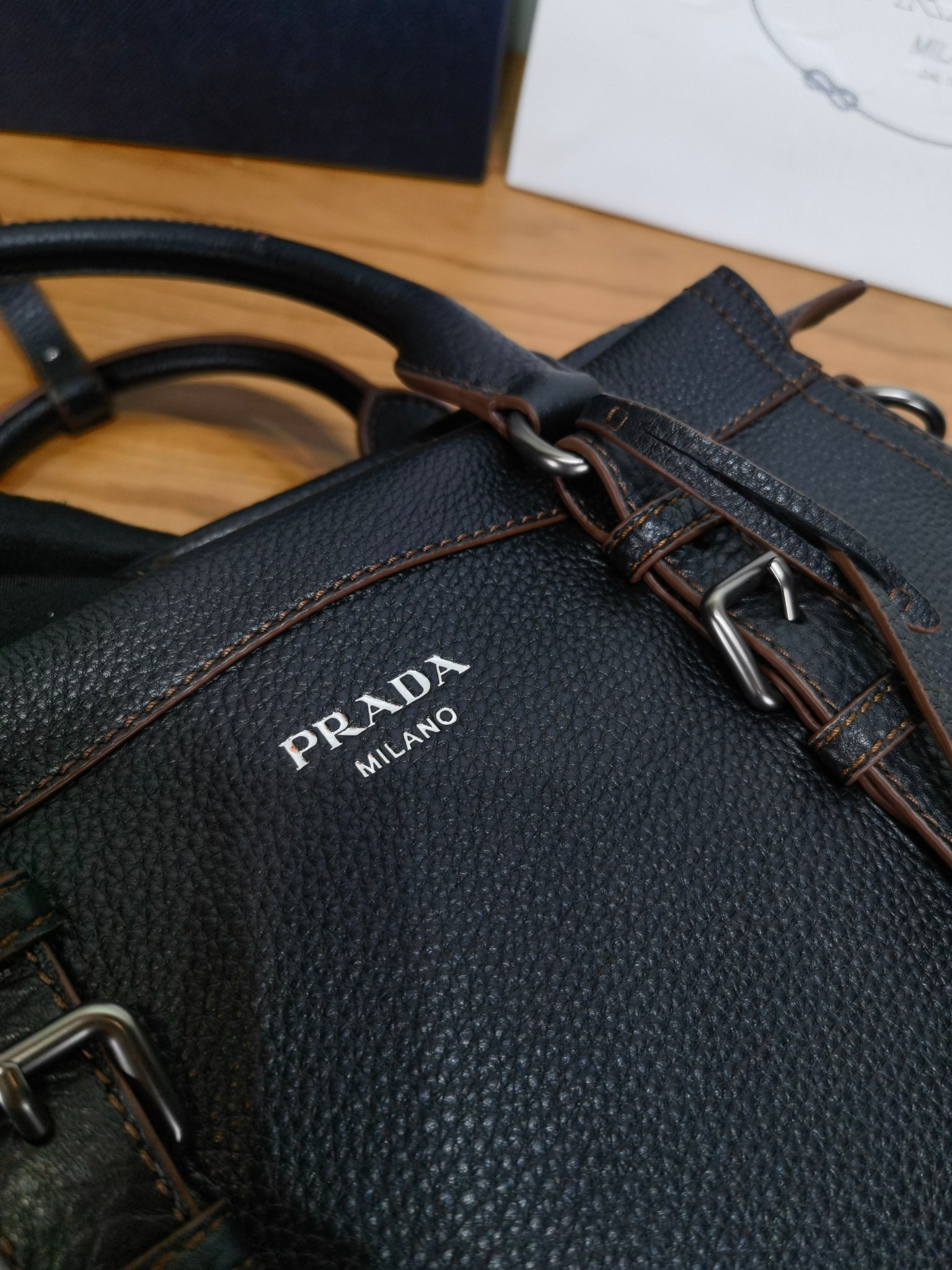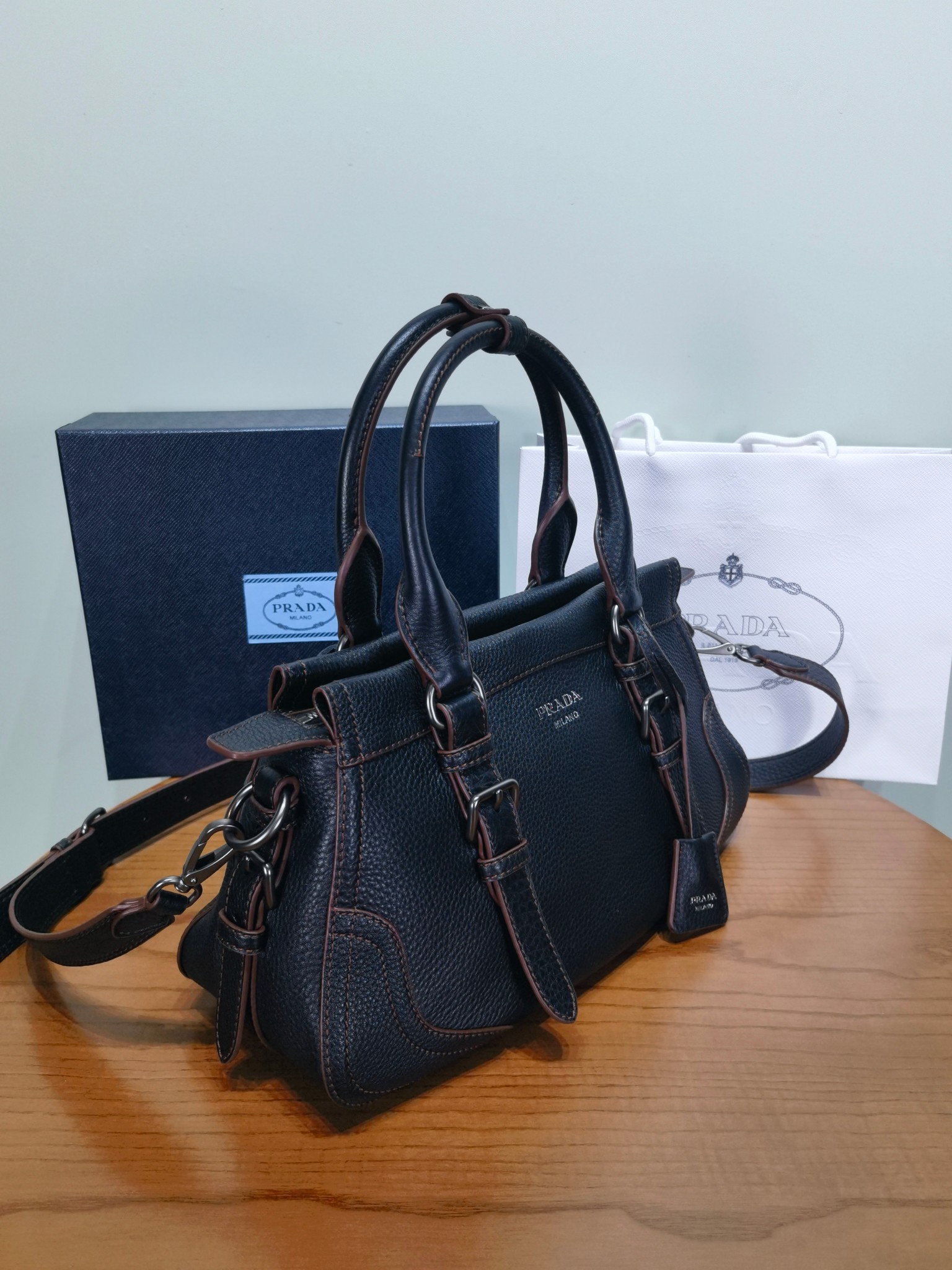 以設計重返Prada DNA的根源,喚起旅行主題。 這款緊湊多功能的皮革廓形,質地豐富柔軟細膩,配有可拆卸肩帶,可多種方式佩戴。 加固的角落,靈感源自旅行包,展現了與傳統工藝和檔案的持續對話